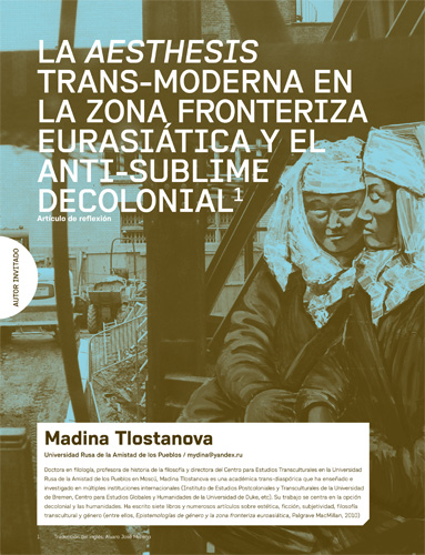 El artículo estudia la aesthesis transmoderna en relación con la agenda de liberar la esfera estética de los mitos de la modernidad occidental. La autora ofrece un resumen crítico de las principales corrientes estéticas occidentales frente al anti-sublime decolonial como modelo alternativo analizado en el artículo. Se presta especial atención al mecanismo de este sublime, fundado en una hermenéutica pluritópica y una “comunidad de sentido” decolonial que une a quienes fueron marcados por la “herida colonial”. El artículo se enfoca en la reformulación decolonial de problemáticas estéticas usuales, como la correlación de belleza y aesthesis, la relación de conocimiento y arte, de la esfera moral y la estética, etc. Finalmente, una larga sección se dedica a la aesthesis decolonial de la zona fronteriza euroasiática, los territorios en el Este (Asia Central) y Sur (Cáucaso) del continente euroasiático, que antes eran colonias rusas/soviéticas, y producen hoy instancias complejas de arte decolonial en las obras de Saule Suleymenova, Zorito Dorzhiev y otros.